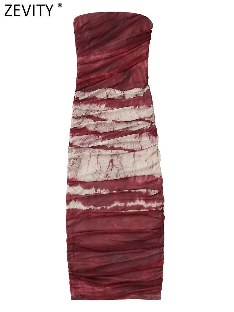 女性のセクシーなストラップレスパッチワーク水墨画プリントスリムミディドレスシックなバックジッパープリーツ Vestidos DS2115
