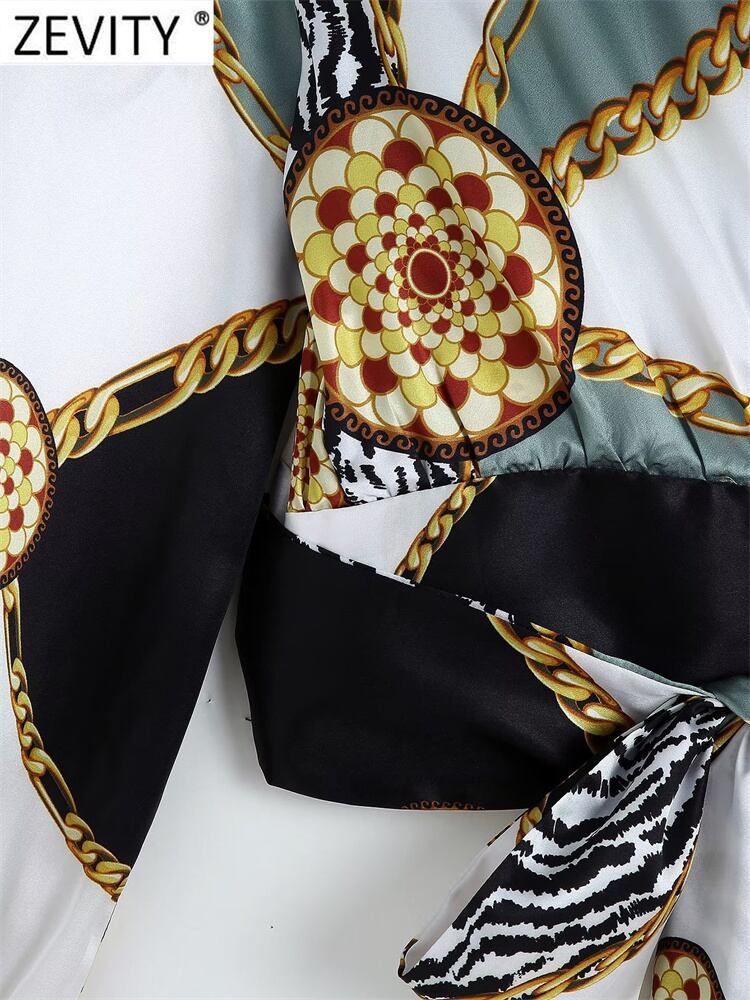 レディースクロスVネックチェーン プリント柄パッチワークショートブラウス リボンシャツトップス Amy24690768739