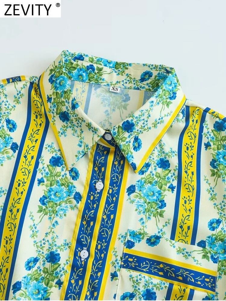 レディースストライプFlowerデザイン プリント柄ブラウス シングルポケットシャツトップス フラワーデザイン 会社 学校 通勤や通学にも Amy78928951704