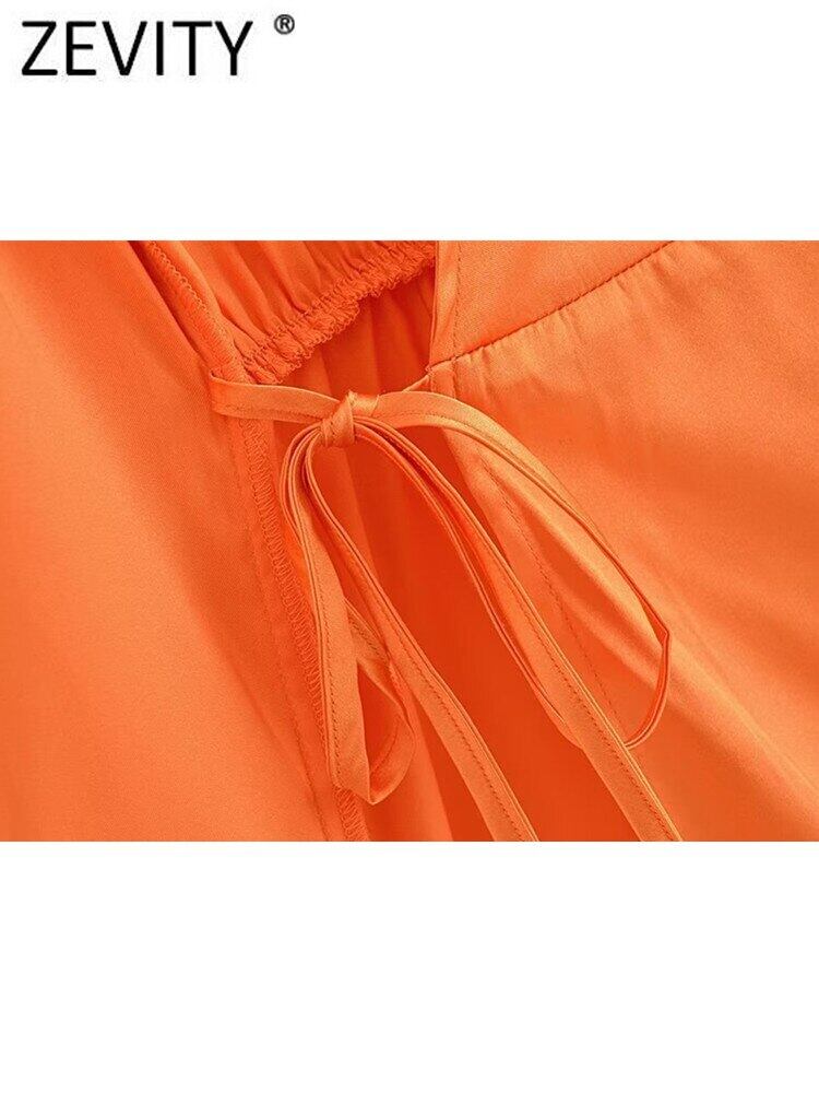 女性オレンジ色の蝶結びラップミニドレスオフィスレディ長袖ソフトサテン Vestidos DS2417 ロング リボン 会社 学校 通勤や通学にも