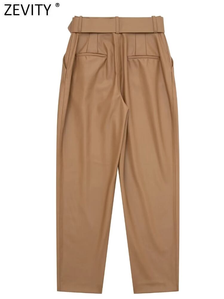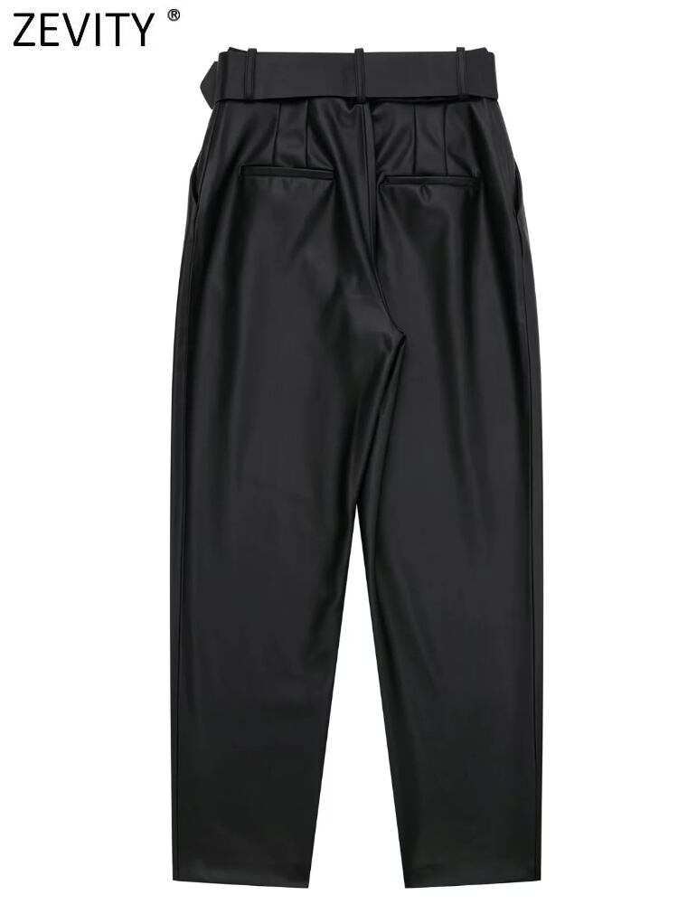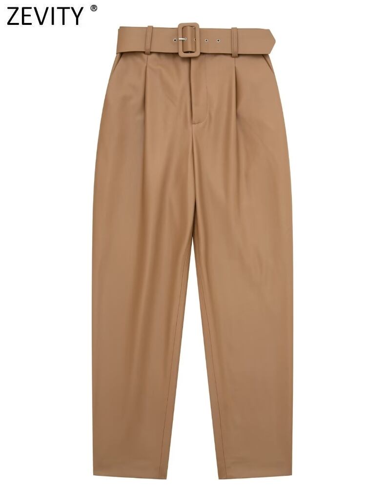 女性サイドポケットプリーツ PU レザーハーレムパンツオフィスレディバックルサッシジッパーフライズボン P2927 会社 学校 通勤や通学にも