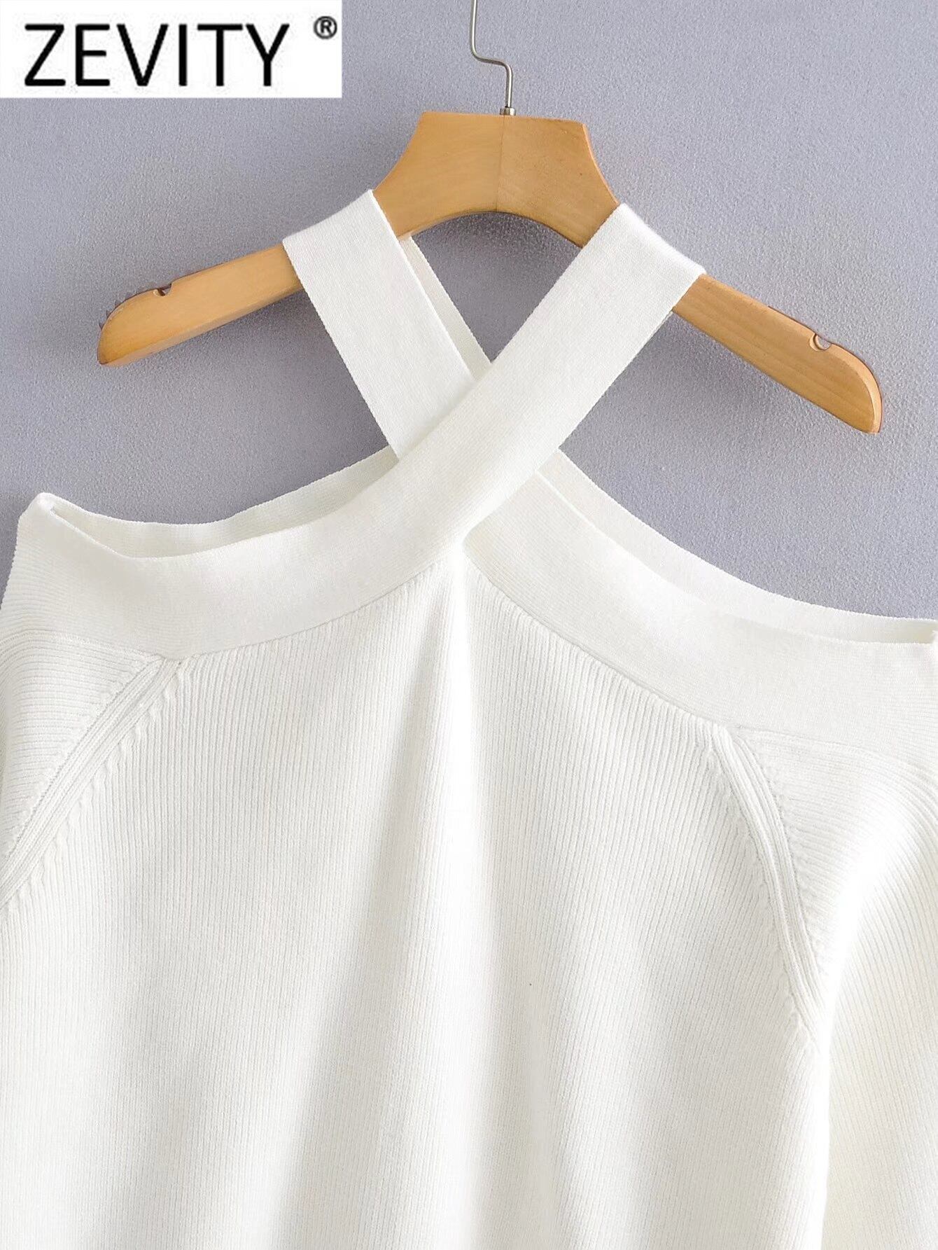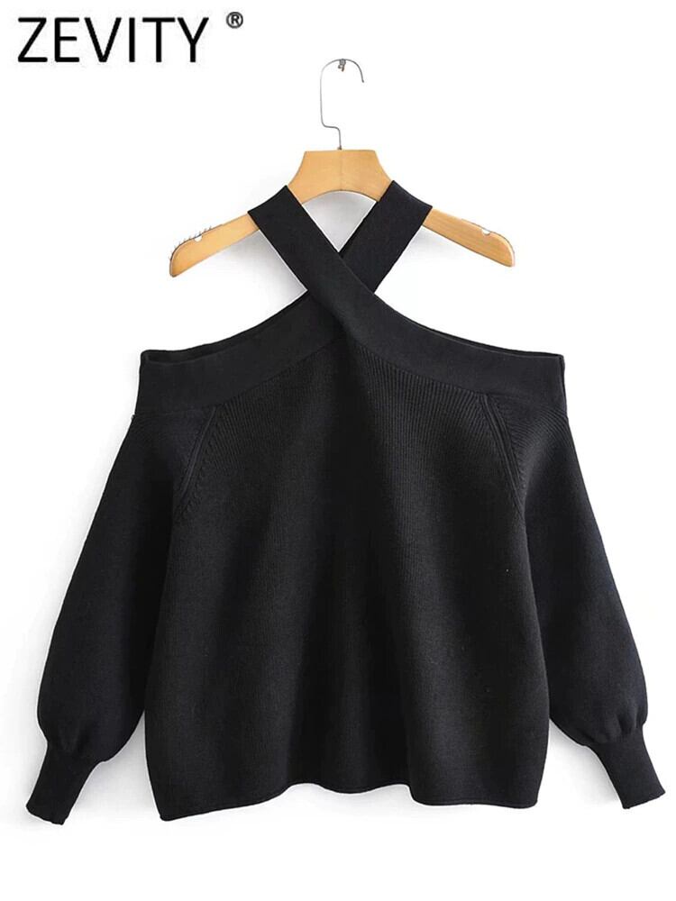 女性オフショルダーブラックホワイトカラーホルターニットセーターシックな長袖プルオーバートップス SW2395 ロング