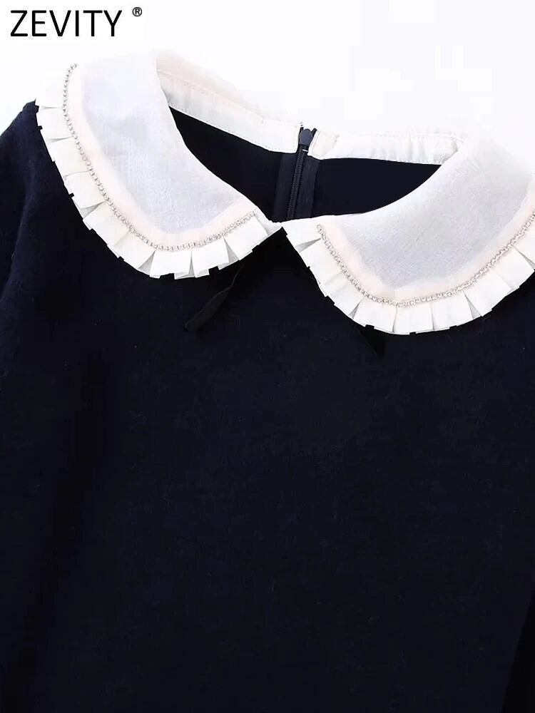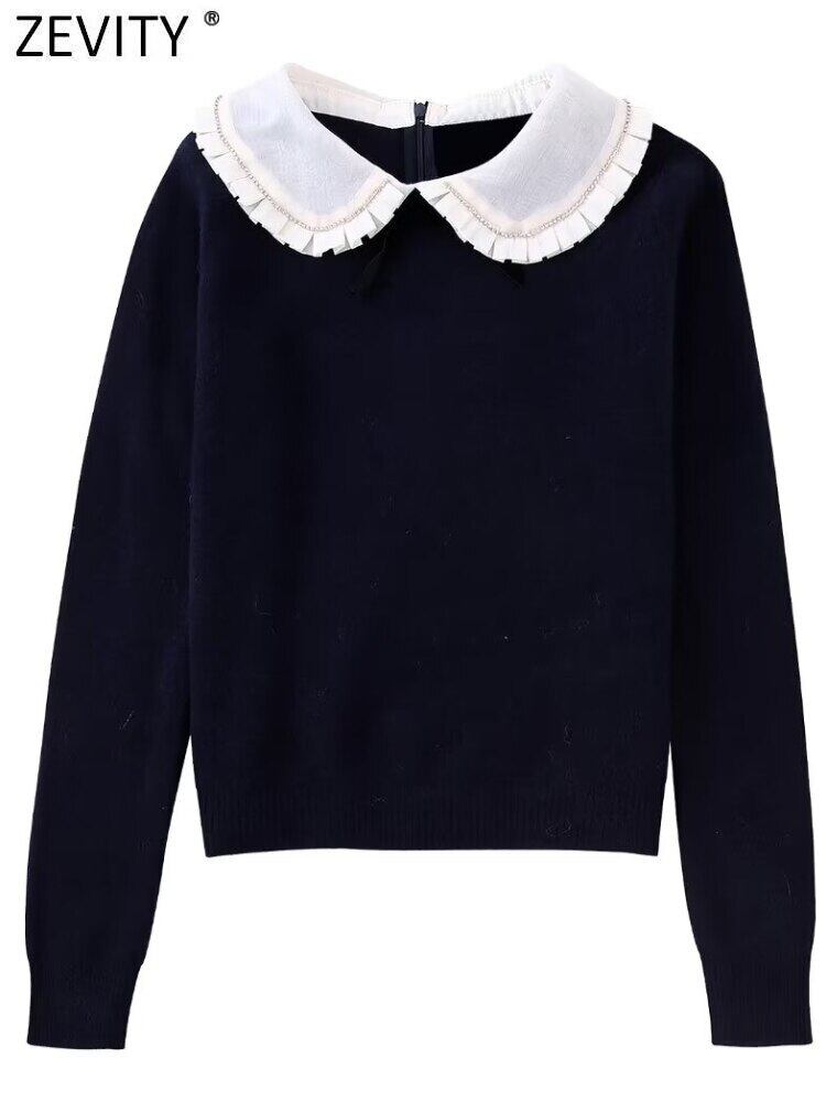 女性スウィートダイヤモンドビーズフリルターンダウン襟ニットセーターシックなバックジッパープルオーバートップス SW2952 ラッフル 大人ガーリー キュート カジュアル