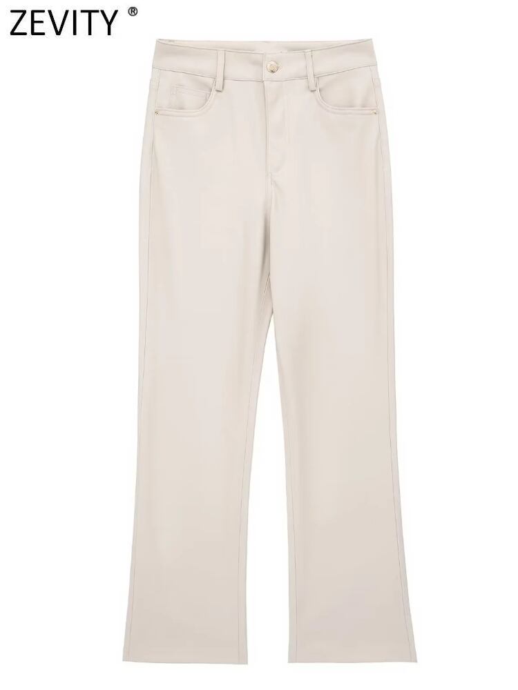 女性ポケット PU レザー スリム フレア パンツ オフィス レディ ジッパー フライ カーフ丈ズボン P2929 会社 学校 通勤や通学にも