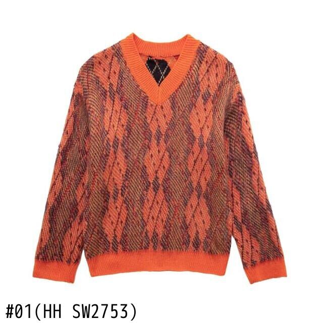 女性 V ネック ダイヤモンド パターン ニット セーター秋長袖幾何プルオーバー トップス SW2753 ロング オータム 秋物 Vネック
