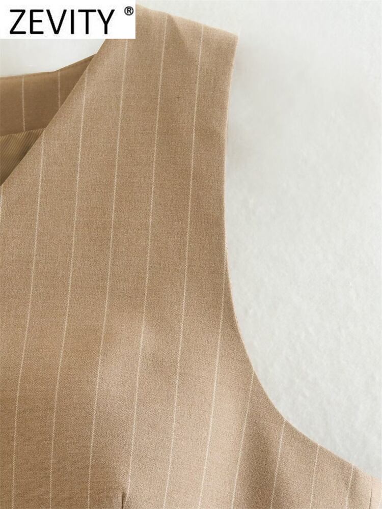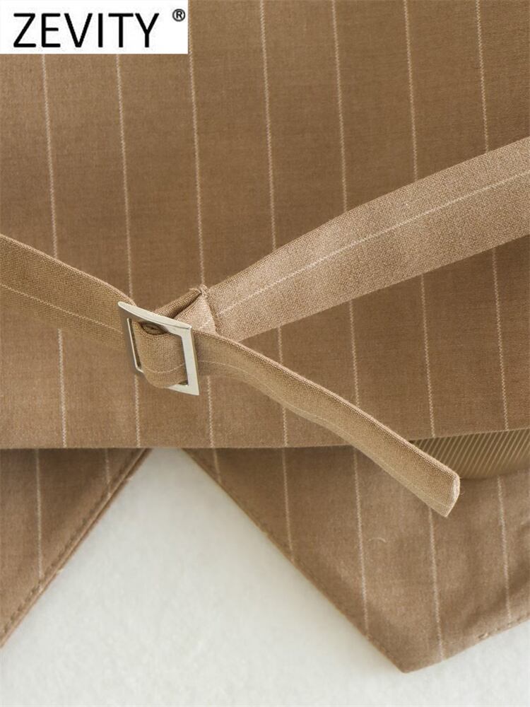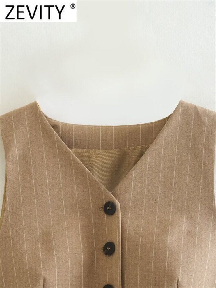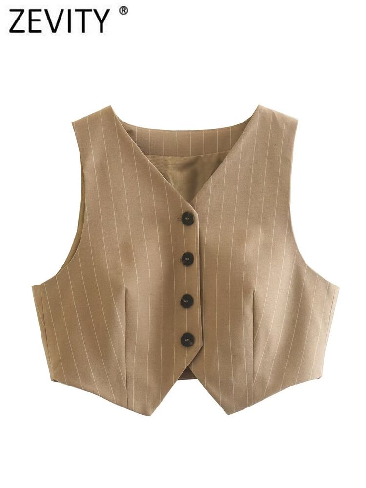 女性 V ネック シングル ブレスト ストライプ プリント ショート ベスト ジャケット ノースリーブ バックル チョッキ クロップ トップス CT3539 Vネック