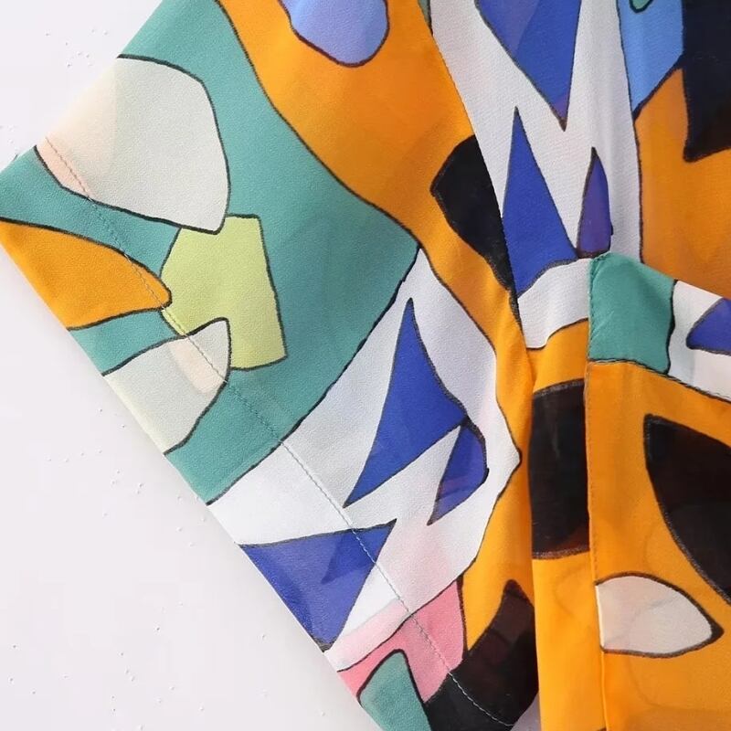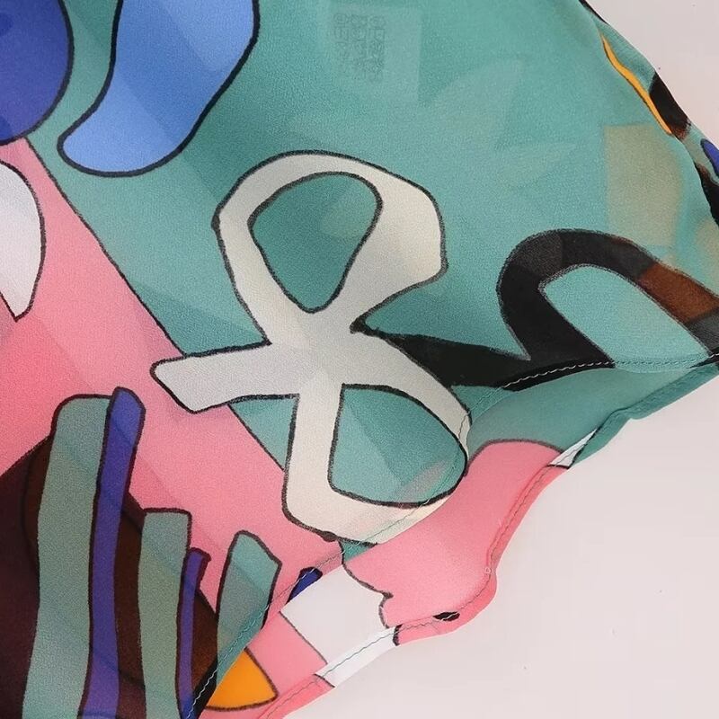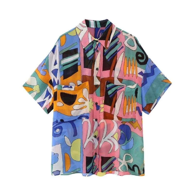パッチワーク落書きプリントシフォンスモックシャツ半袖レジャーブラウスシックトップス LS1000 ショート ハーフスリーブ