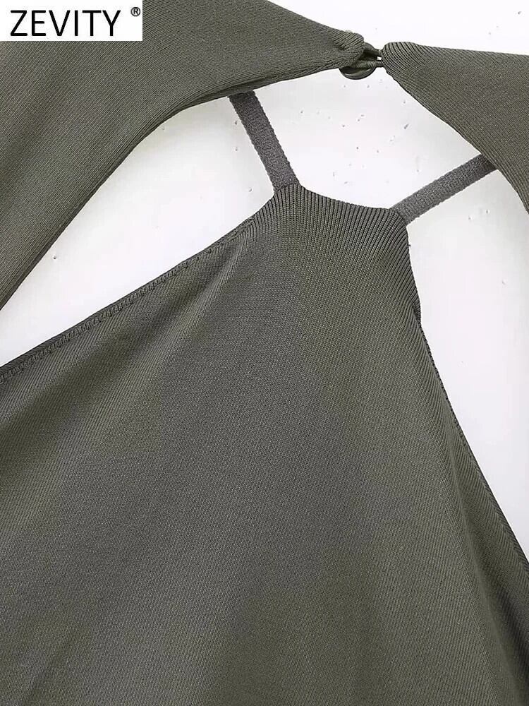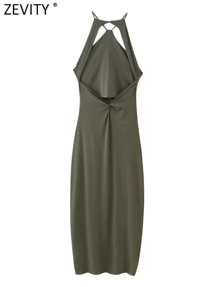 セクシーノースリーブスパゲッティストラップアウトホルターミディドレスシック背中開いたプリーツパーティー Vestidos DS5389