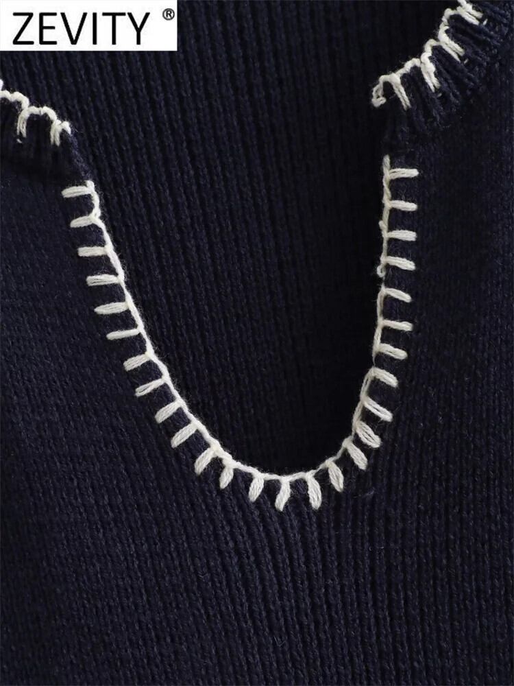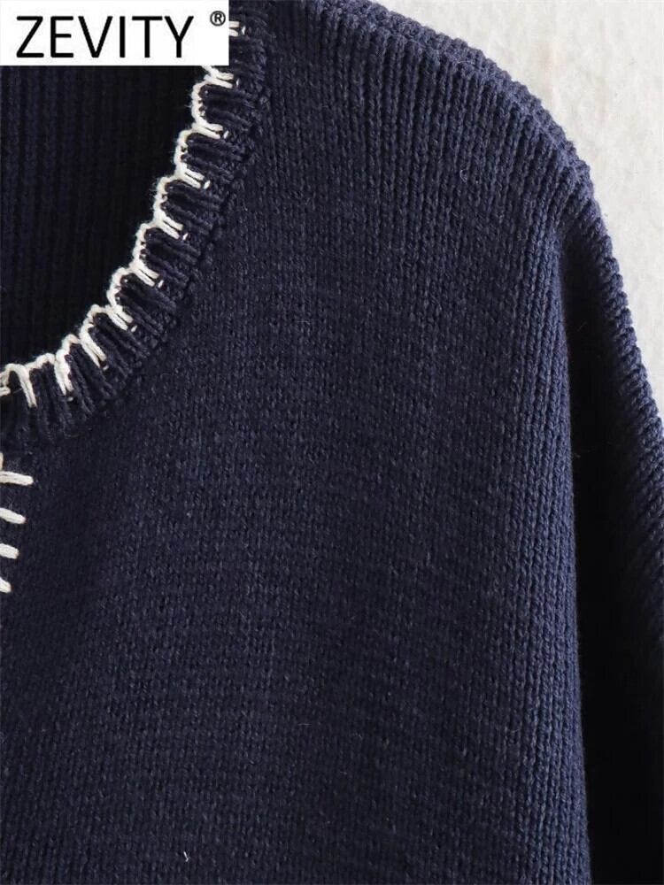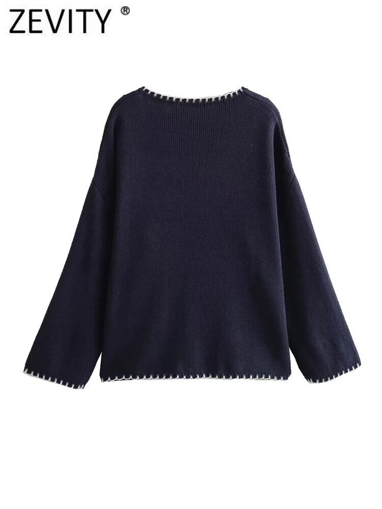 ZEVITY V ネック白ラインポケットパッチニットセータールーズプルオーバーシックトップス SW5402 ホワイト Vネック