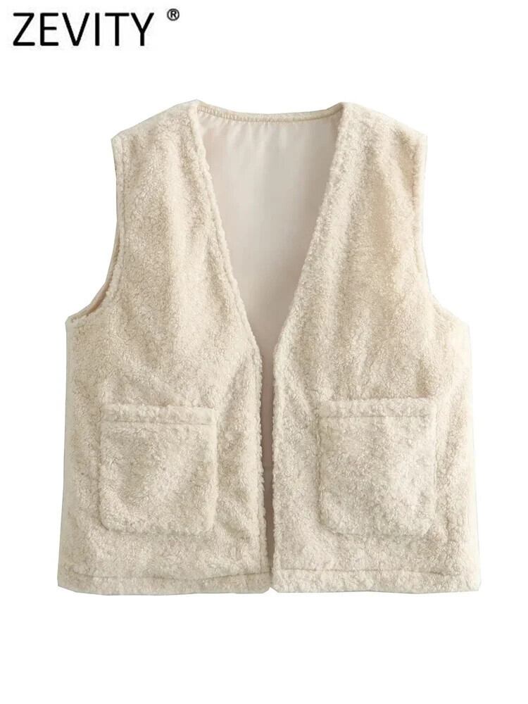 V ネックラムウールノースリーブベストジャケットポケットパッチカーディガンチョッキトップス CT5349 Vネック