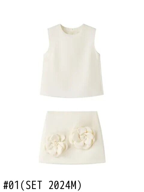 O ネックノースリーブベストブラウスと大き花アップリケミニスカート 2 点セット SET2024 Oネック ソリッドカラー フラワーデザイン
