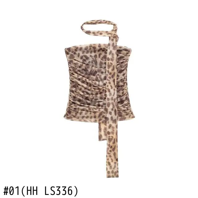 ストラップレスヒョウプリーツホルターブラウス背中開いたスリムメッシュシャツシッククロップドトップス LS336