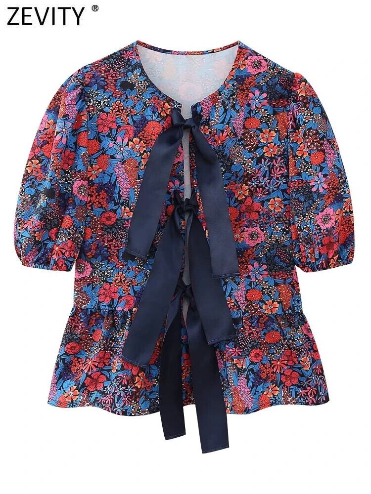 O ネックパフスリーブ花柄ブラウスオフィスレディ蝶ネクタイシャツシックトップス LS263 リボン Oネック 会社 学校 通勤や通学にも