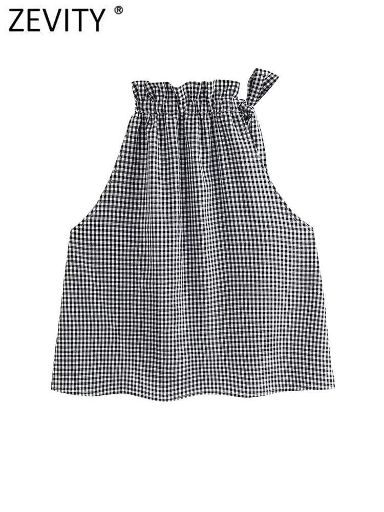 甘いノースリーブチェック柄プリント巾着レースアップ弓ベストブラウスレディシックフリルシャツトップス LS325 リボン ラッフル 大人ガーリー スウィート キュート カジュアル