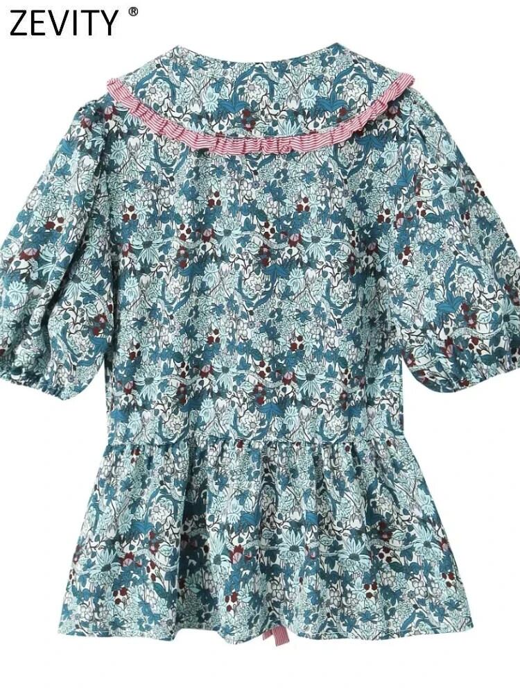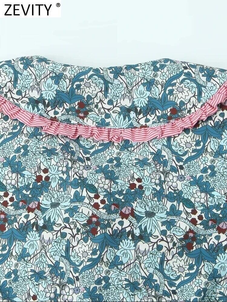 2024 甘いピーターパン襟フラワープリントスモックブラウスシックボウストライプステッチシャツトップス LS6179 リボン 大人ガーリー スウィート キュート カジュアル フラワーデザイン