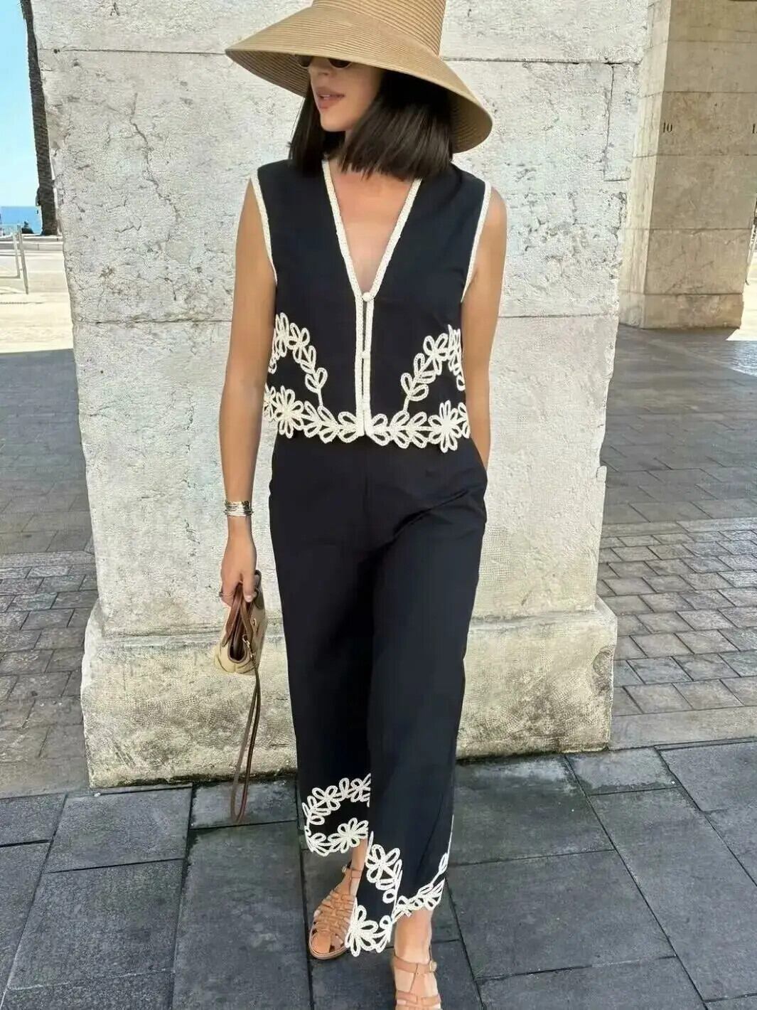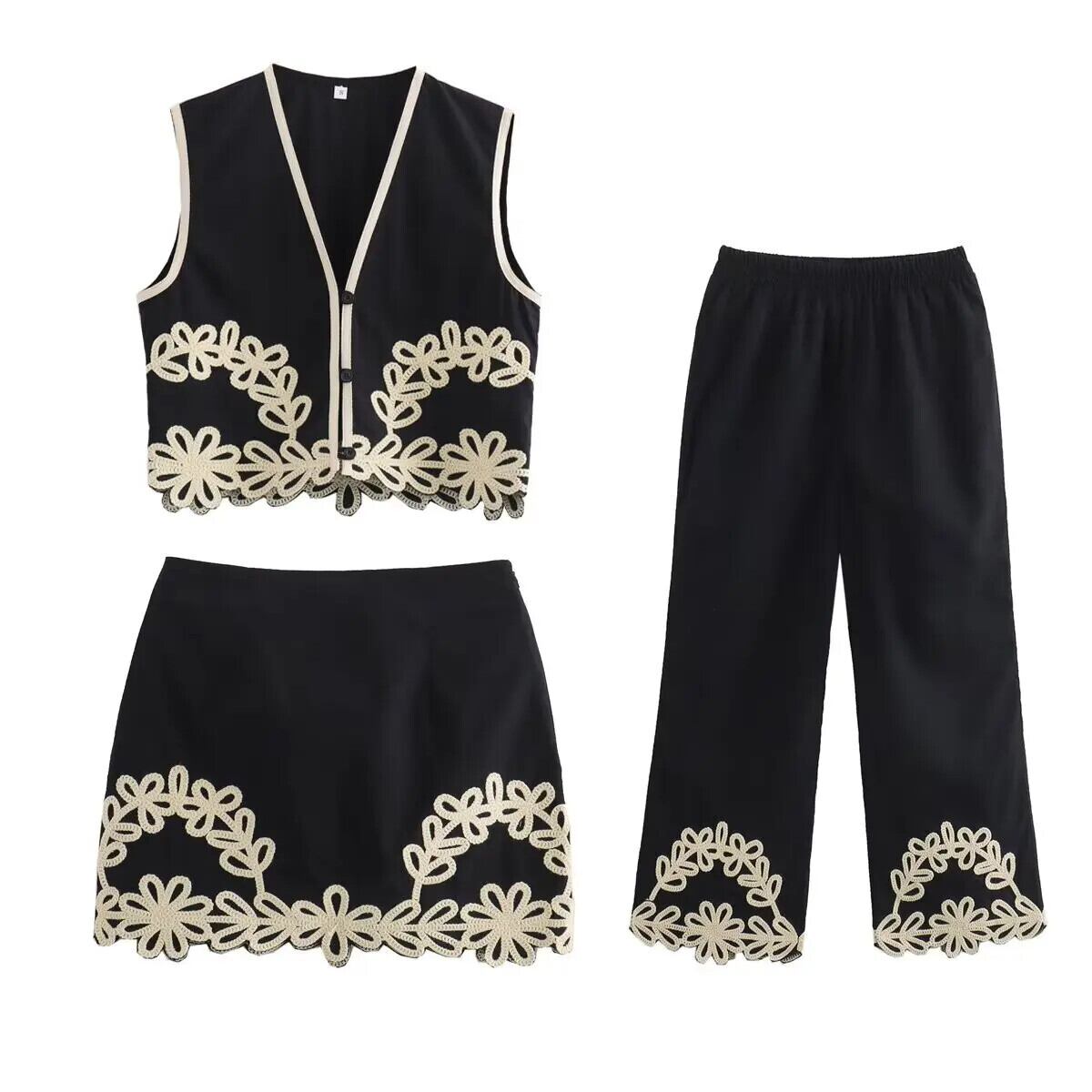 ユーロスタイル V ネックフラワーアップリケ刺繍ショートベストジャケットノースリーブボタンスリムチョッキトップス CT6207 Vネック フラワーデザイン